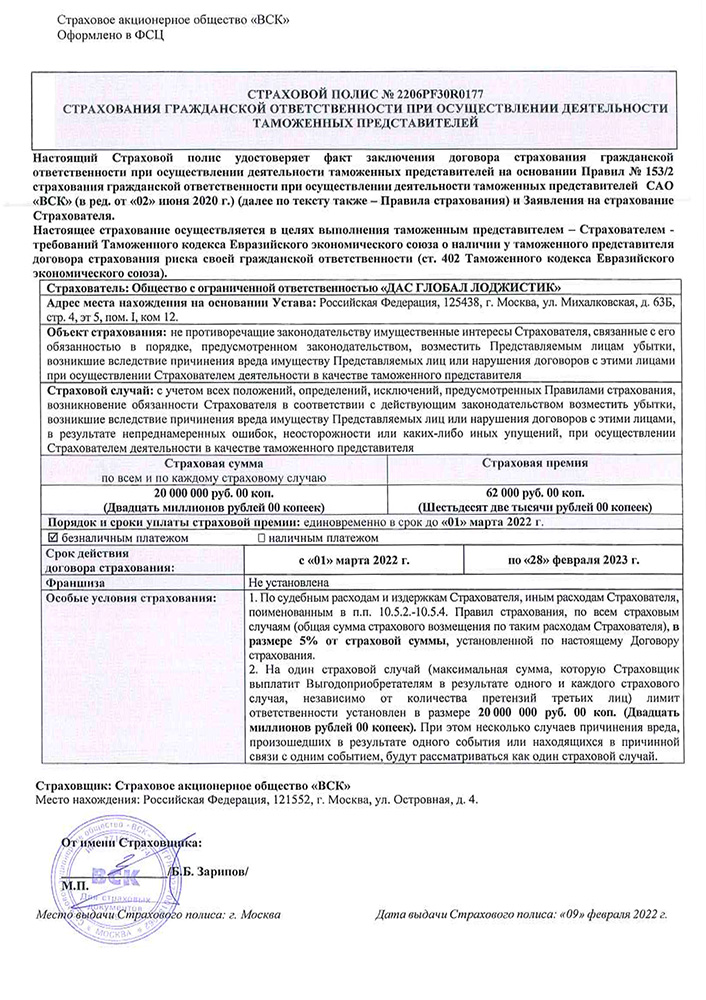 • Страховой полис (ОАО «ВСК») № 2206PF30R0177 от 01 Марта 2022 г. – страхование гражданской ответственности при осуществлении деятельности таможенных представителей.