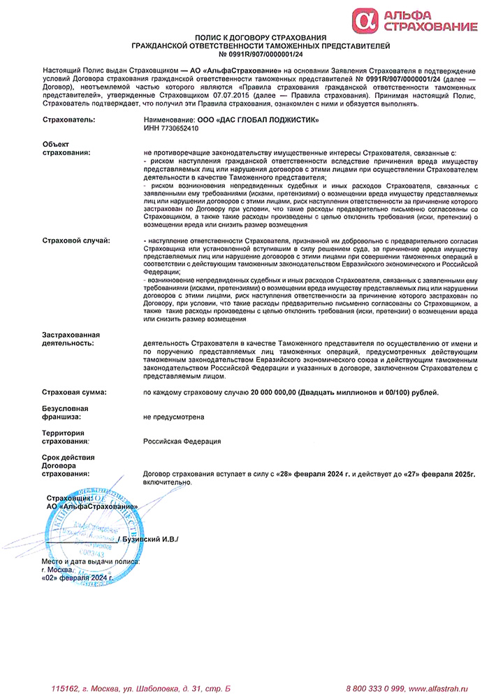 • Страховой полис (АО «АльфаСтрахование») № 0991R/907/0000001/24 от 28 Февраля 2024 г. – страхование гражданской ответственности при осуществлении деятельности таможенных представителей.