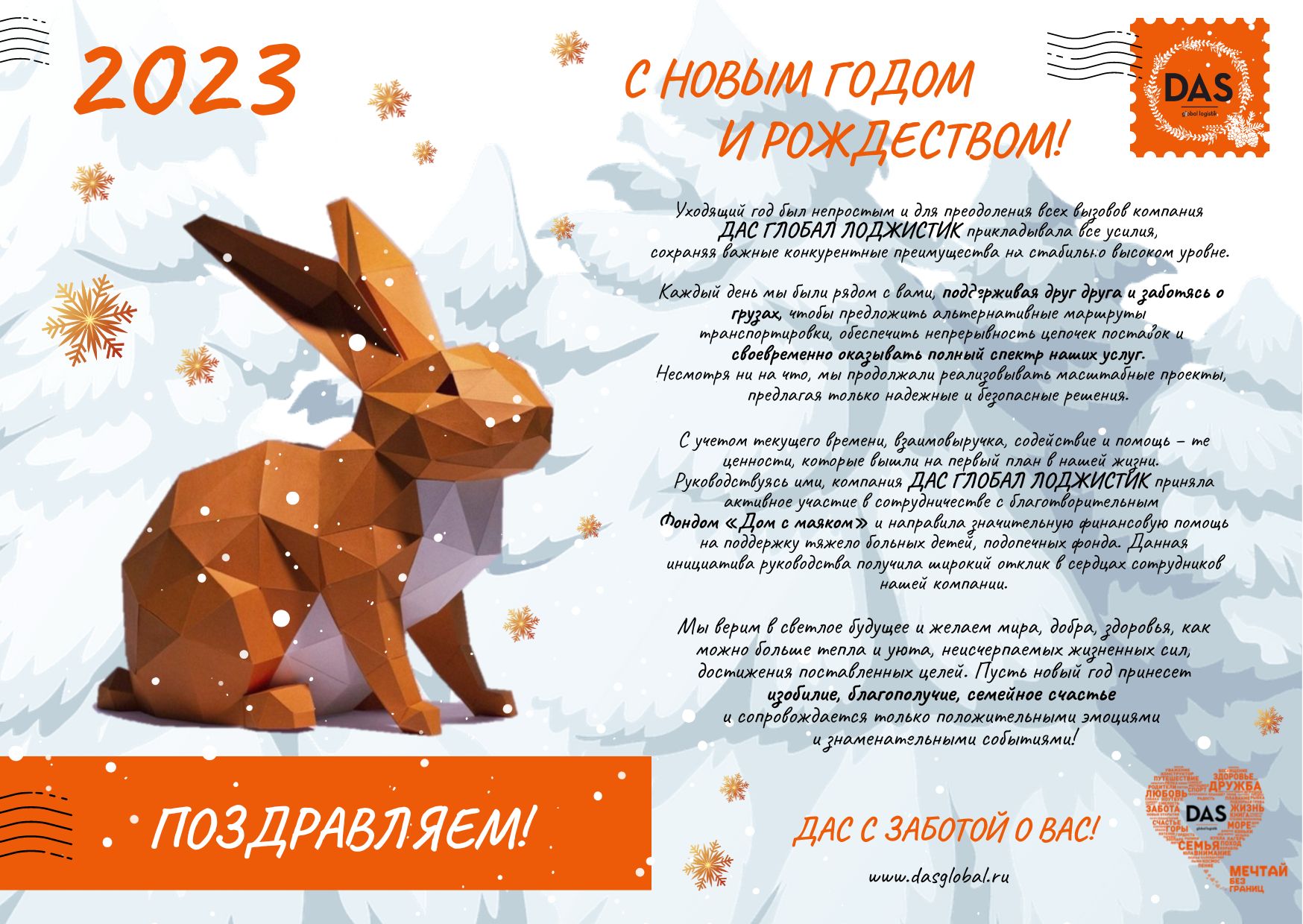 Компания ДАС ГЛОБАЛ ЛОДЖИСТИК продолжает новогоднюю программу по поздравлению клиентов и партнеров компании с предстоящими праздниками.